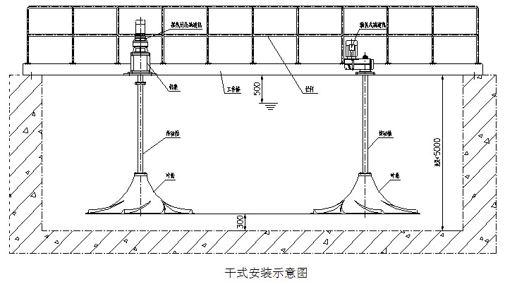 干式安裝的攪拌機(jī)先將減速機(jī)機(jī)架固定在工作橋上,然后只需依次安裝傳動(dòng)軸,葉輪部件,并固定好電纜,見(jiàn)干式安裝示意圖。