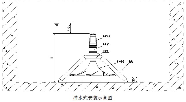 濕式安裝的攪拌機(jī)可通過(guò)吊機(jī)或起吊架直接將攪拌機(jī)吊入指定位置,依靠設(shè)備自重定位,固定好電纜。見(jiàn)濕式安裝示意圖。